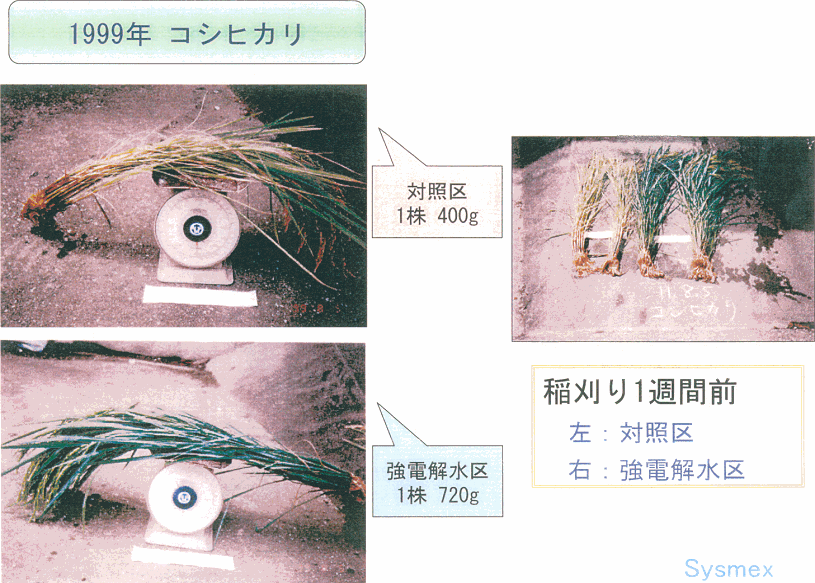 使用超電解水的稻米植株根莖發育良好,每株重量增加320克,且收成最高可提升50%,如圖表所示。